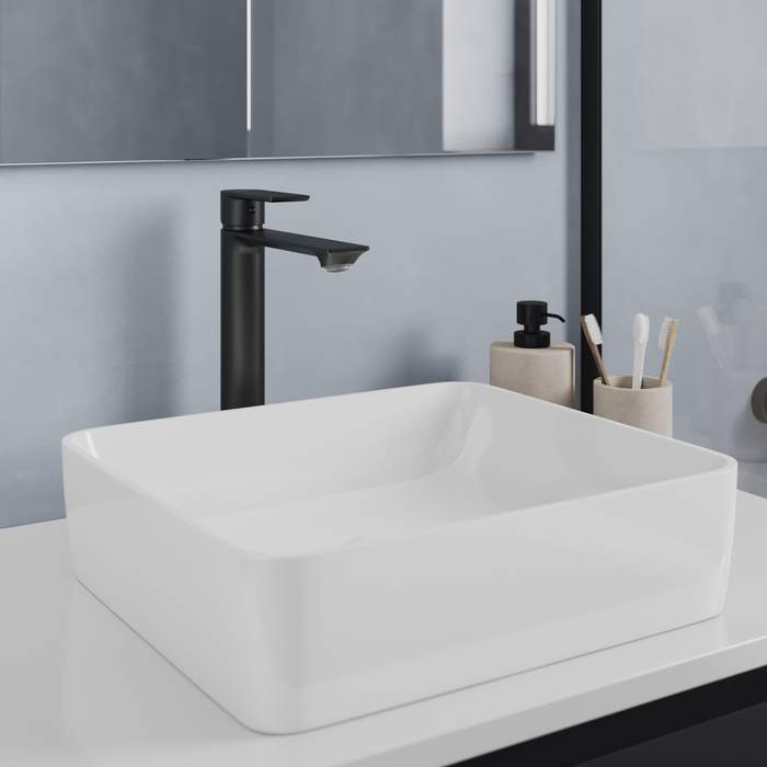 Установка смесителя в высоком корпусе (304 мм) возможна как на умывальник, так и на мебельную тумбу или столешницу с настольным умывальником-чашей. В комплекте идут гибкая подводка и крепеж.