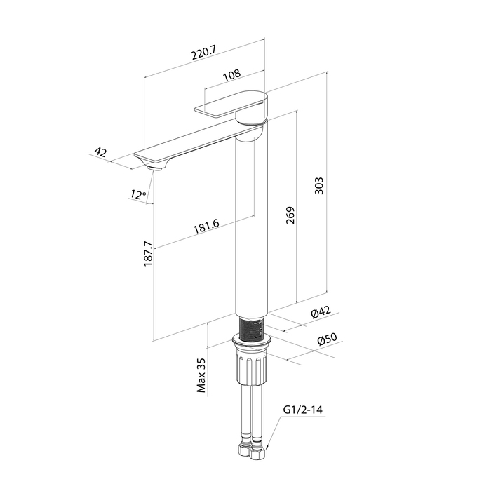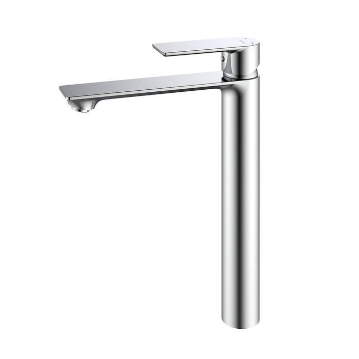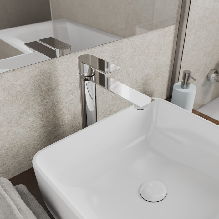Установка смесителя в высоком корпусе (304 мм) возможна как на умывальник, так и на мебельную тумбу или столешницу с настольным умывальником-чашей. В комплекте идут гибкая подводка и крепеж.