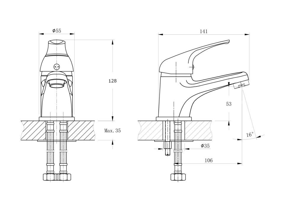 В смеситель установлен картридж D-40 (RSH402) с керамическими пластинами. Высота смесителя 128 мм. Излив литой, неповоротный, 106 мм. Высота излива до аэратора 53 мм. Аэратор изготовлен из пластика с нержавеющим корпусом, угол наклона - 16 гр.