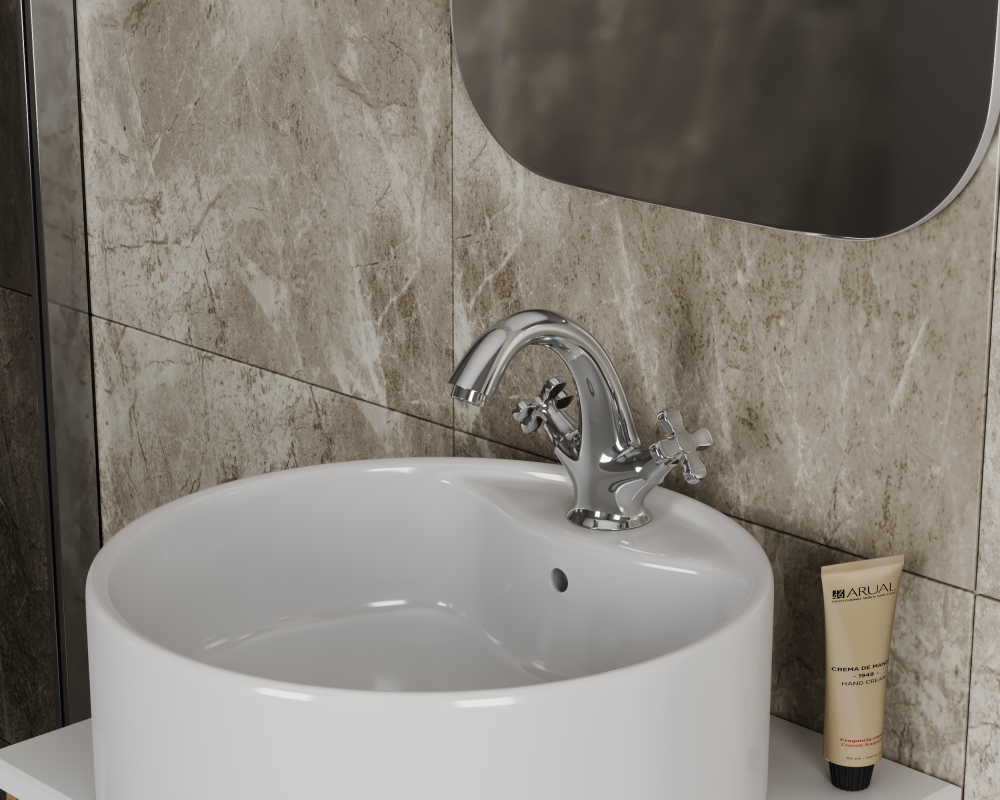 Смеситель для раковины RUSH арт. SA5350-11 с металлической ручкой из коллекции Sakhaline изготовлен из высококачественной латуни и имеет вентильное управление.