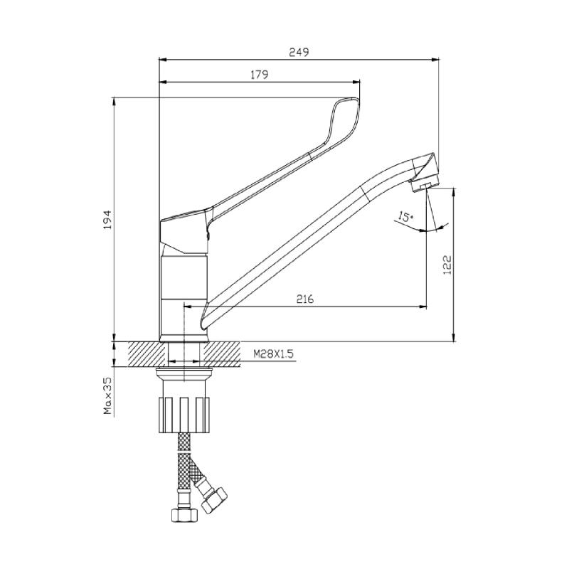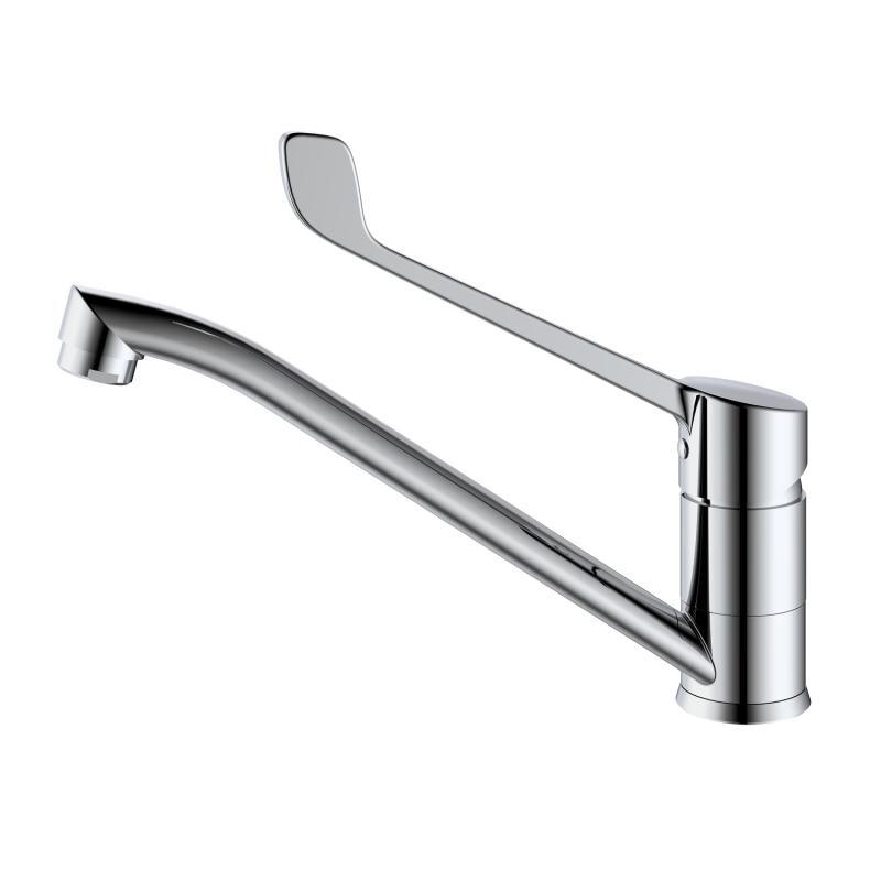 S08.42 Смеситель для раковины/мойки с хирургической ручкой локтевой, изготовлен из латуни, керамический картридж 35 мм, хром покрытие. Подводка 50 см, на усиленной гайке. Гарантия 5 лет.