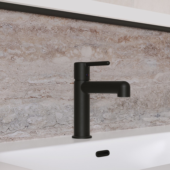 Стильный смеситель для умывальника, где удачно сочетает актуальный современный дизайн и популярный черный цвет. Тонкая удлиненная ручка добавляет смесителю изящества и комфорт в управлении. Расстояние между ручкой и изливом увеличено для большего удобства.