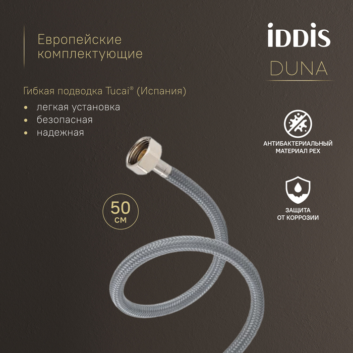 — Гибкая подводка Tucai® (Испания): безопасна для здоровья благодаря шлангу из нетоксичного материала PEX с антибактериальным эффектом, нейлоновая оплетка для защиты от коррозии и износа, увеличенная длина 50 см упрощает монтаж.