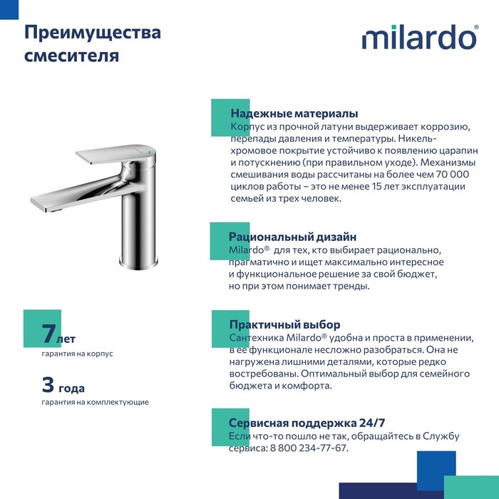 • Гарантия на смеситель Milardo® – 7 лет, на картридж – 3 года.