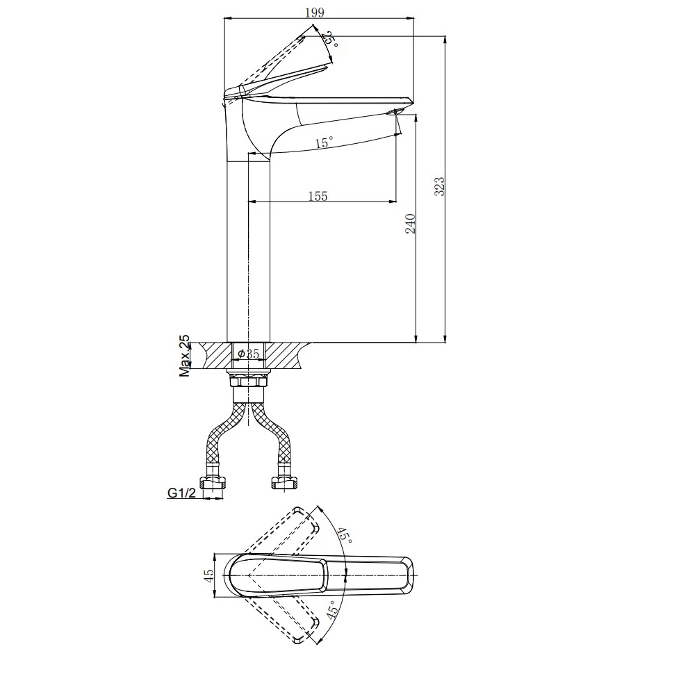 В смеситель установлен картридж D-35 с керамическими пластинами. Высота смесителя 323 мм. Излив литой неповоротный 155 мм. Высота излива до аэратора 240 мм. Аэратор изготовлен из пластика с нержавеющим корпусом, угол наклона - 15 гр.