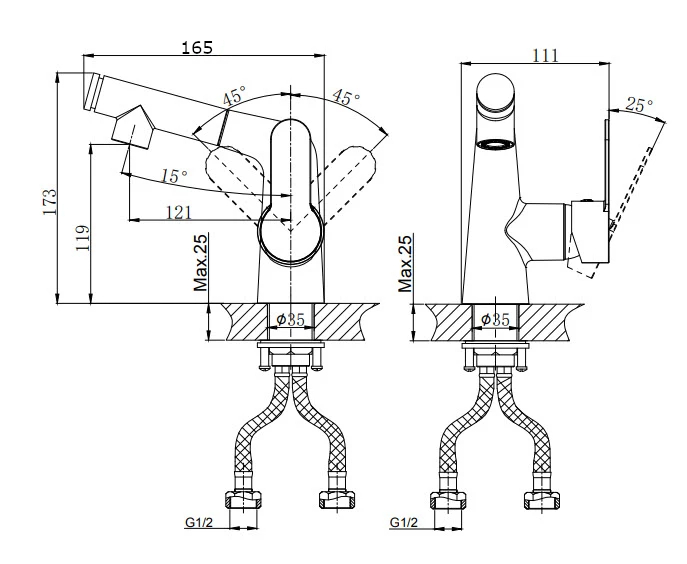 В смеситель установлен картридж D-35 с керамическими пластинами. Высота смесителя 173 мм. Излив литой, неповоротный 121мм. Высота излива до аэратора 119 мм. Аэратор изготовлен из пластика с нержавеющим корпусом, угол наклона - 15 гр.