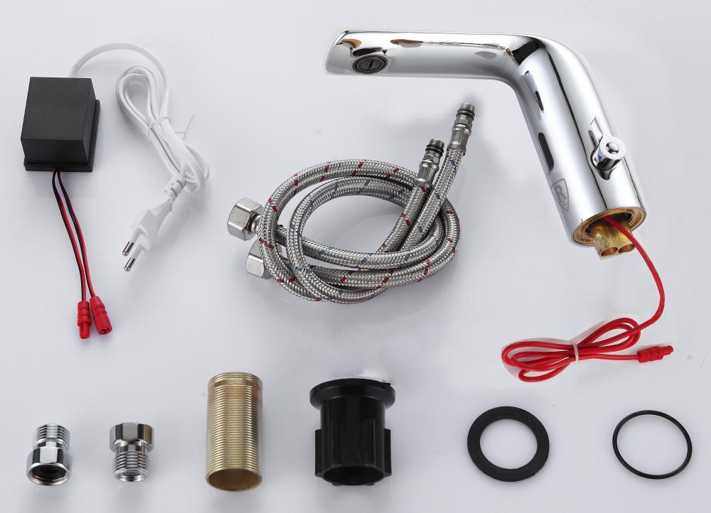 Смеситель, гибкая подводка 55см 2шт, универсальная присоединительная группа для установки на горизонтальную поверхность, блок питания, провод с разъемом, индивидуальный пакет, паспорт. (батарейки в комплект НЕ входят)