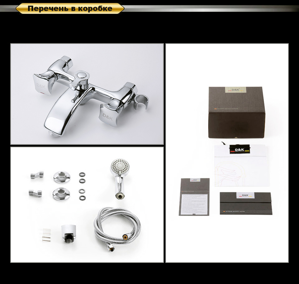 Смеситель, эксцентрики-2шт, декоративная шайба (отражатель)-2шт, шланг душевой, лейка душевая-3 режима, держатель душевой лейки, паспорт, брендовая сумка