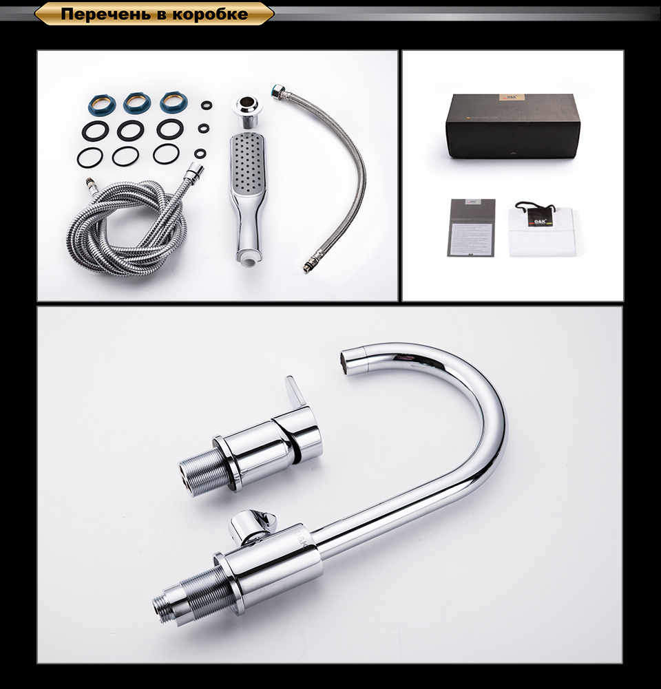 Смеситель, излив с дивертером (переключатель), крепёжная гайка-3шт, душевой шланг, соединительный шланг, душевая лейка, паспорт, брендовая сумка
