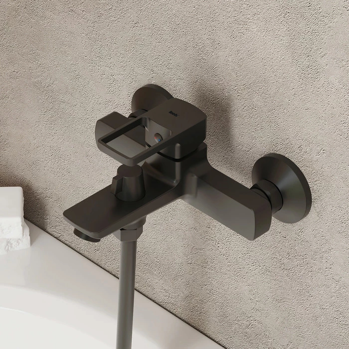 Смеситель для ванны из коллекции Bild в актуальном черном матовом цвете отличается четкими геометрическими формами и уникальным дизайном ручки-петли с тонкой изящной рамкой — ее толщина составляет всего 2 мм. Благодаря улучшенной эргономике ручка смесителя удобно ложится в руку, делая управление невероятно комфортным. Без душевых аксессуаров в комплекте.
