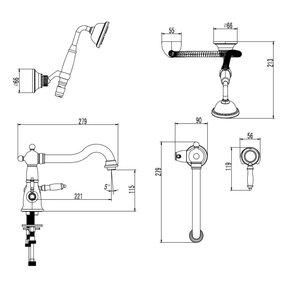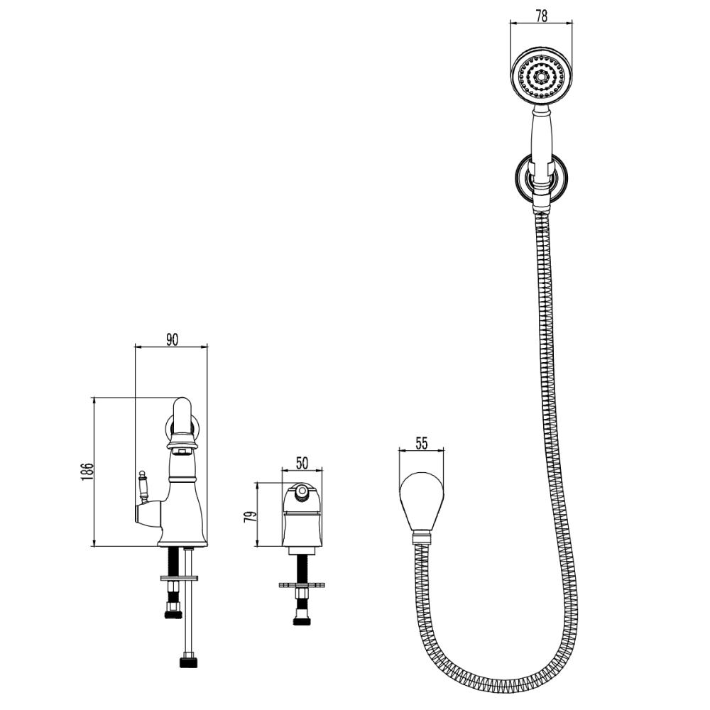 - Аксессуары в комплекте (1-функциональная лейка Ø78х215 мм, настенное поворотное крепление для лейки, подключение душевого шланга, душевой шланг 2 м)