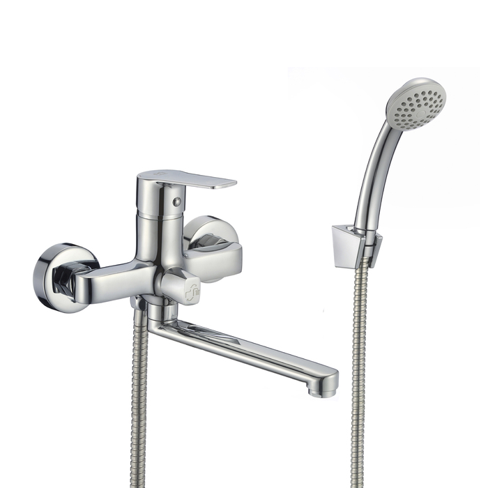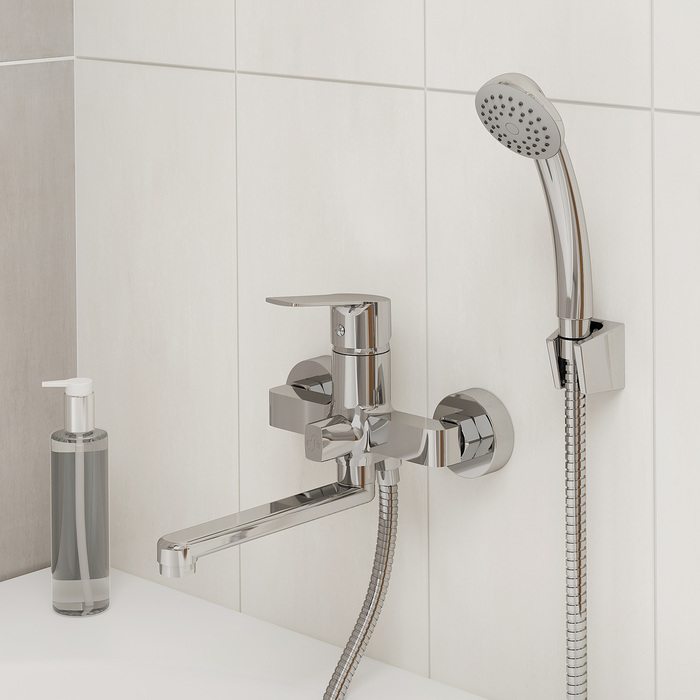 Смеситель для ванны Helic подойдет для современной ванной комнаты. Удобная прямоугольная ручка позволит легко регулировать температуру и напор воды даже мыльной рукой. Компактный излив длиной 172 мм можно повернуть под корпус, благодаря чему смеситель можно использовать и в душевой. В комплекте лейка для душа, шланг и держатель для лейки.