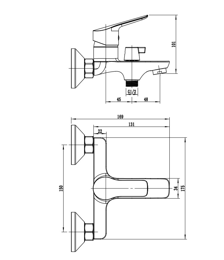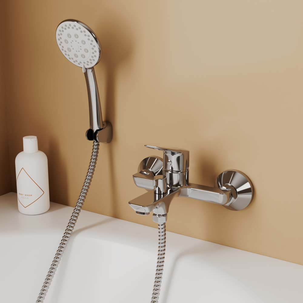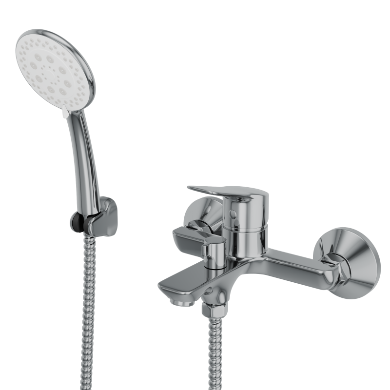 смеситель для ванны и душа, душевая лейка, душевой шланг с латунной гайкой, держатель душевой лейки, универсальная присоединительная группа для установки на вертикальную поверхность, эксцентрики, индивидуальный пакет, паспорт, гарантийный талон.