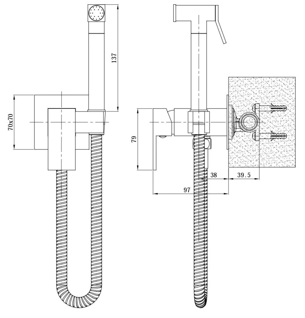 Корпус из латуни внутри + цинковая часть снаружи, ручка из цинка, гигиенический ручной душ из латуни, мягкий шланг из нержавеющей стали длиной 120 см