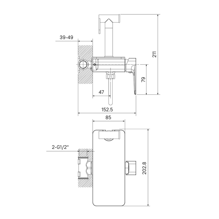 • Гигиеническая лейка из прочной латуни, внутренняя часть и душевой шланг в оплётке из нержавеющей стали (1,2 м) в комплекте.