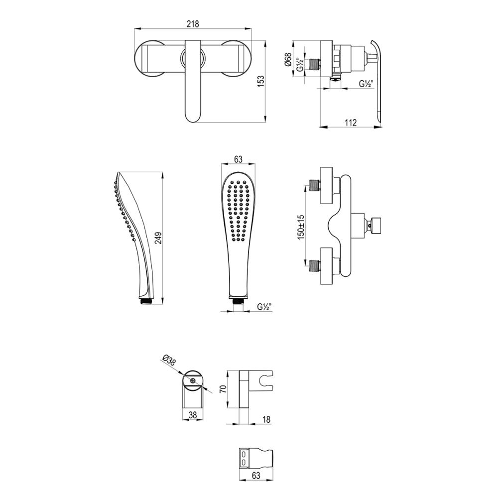 - Аксессуары в комплекте: душевой шланг ПВХ 1,5 м, 1-функциональная лейка 62x249 мм, настенное поворотное крепление