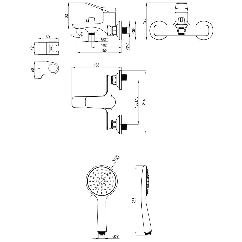 - Аксессуары в комплекте: 1-функциональная лейка Ø106×235 мм, настенное поворотное крепление, душевой шланг 1,5 м