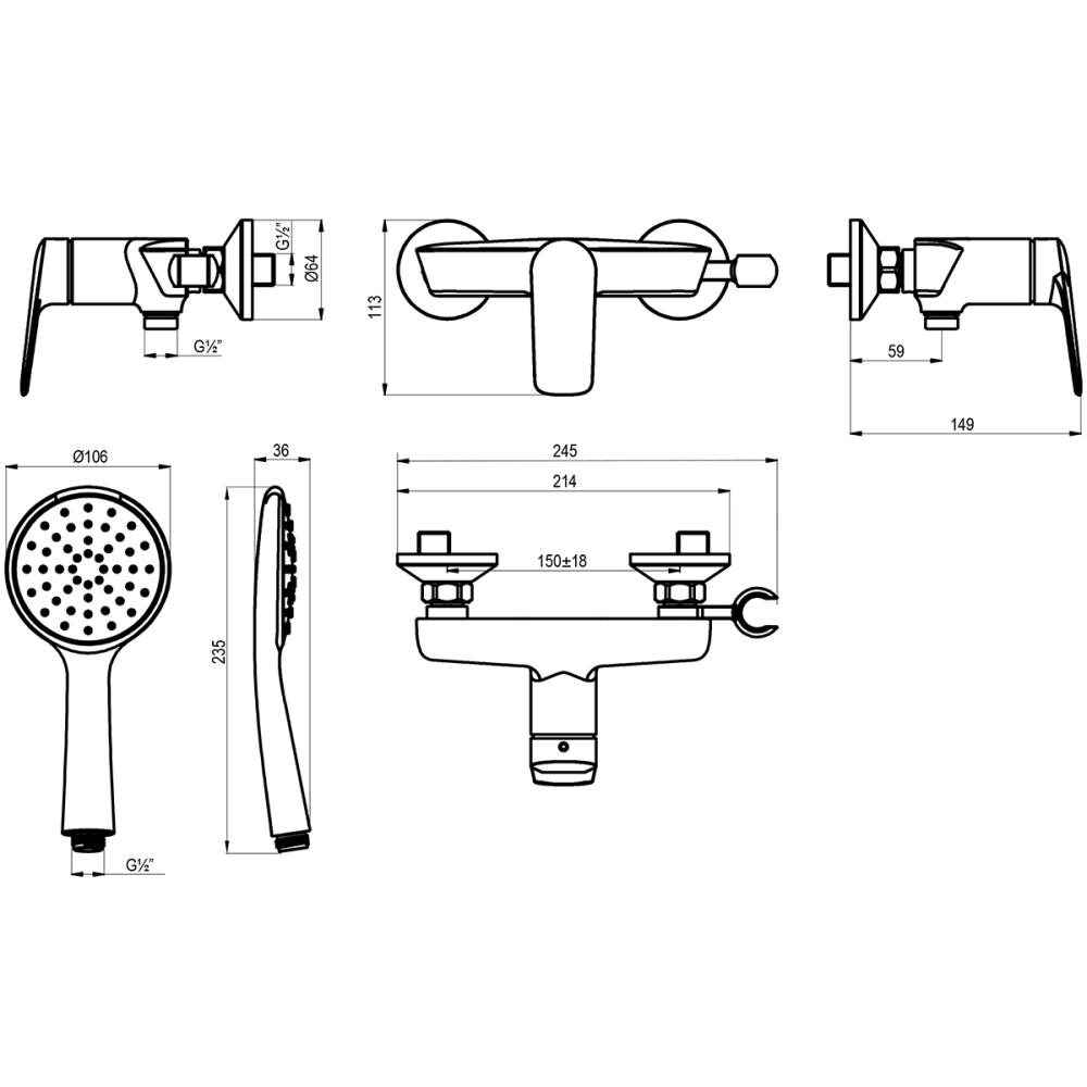 - Аксессуары в комплекте: 1-функциональная лейка Ø106×235 мм, душевой шланг 1,5 м