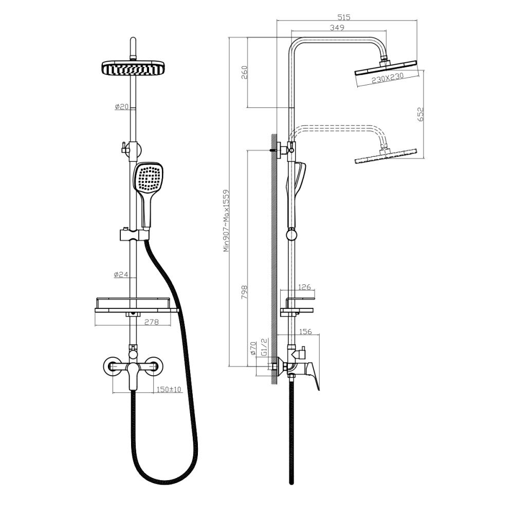 - Регулируемая по высоте полочка для душевых принадлежностей