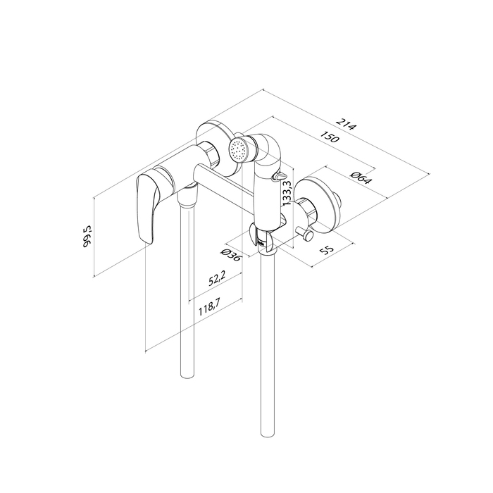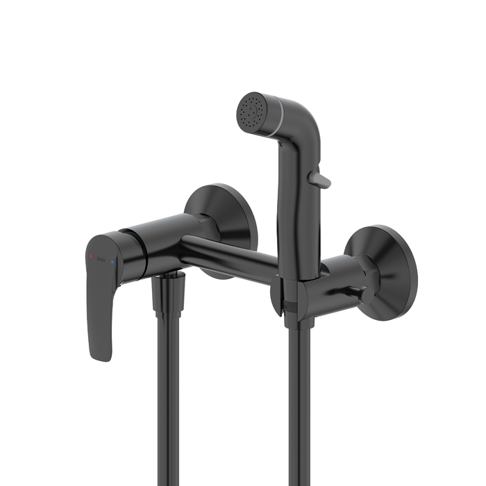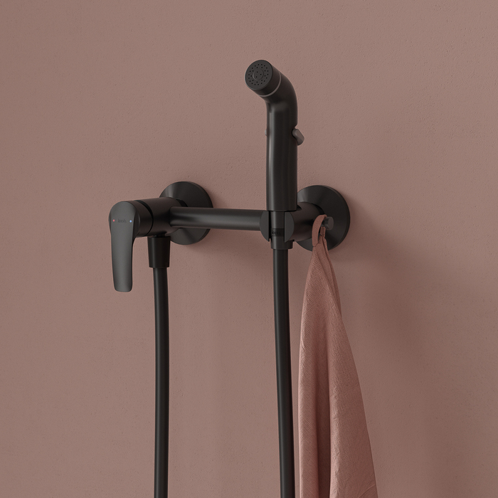Смеситель с гигиеническим душем Ray наружного монтажа на два отверстия в трендовом черном цвете – универсальный практичный дизайн, который подойдёт для разных интерьеров в современном стиле. В комплекте однорежимная лейка и душевой шланг из ПВХ (1,2 м) с двумя коническими гайками. Крючок для полотенца справа от лейки.