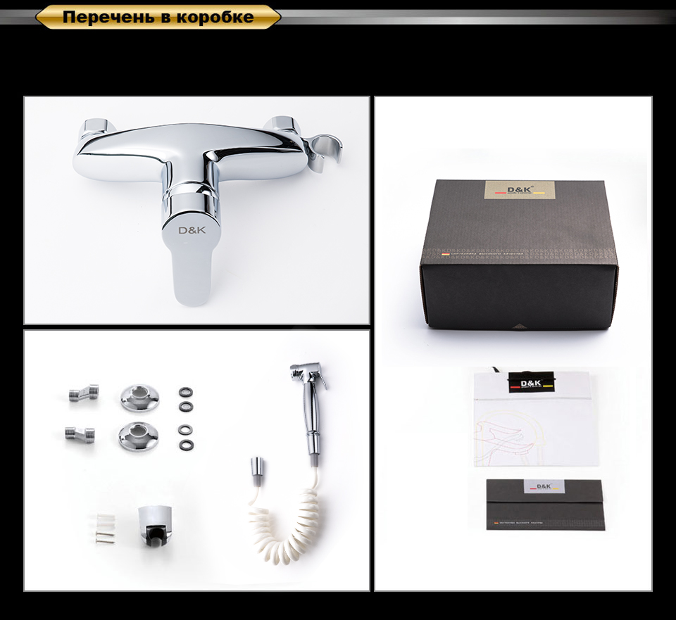 смеситель, эксцентрики-2шт, декоративная шайба (отражатель)-2шт, шланг душевой, лейка гигиеническая, держатель душевой лейки, паспорт, брендовая сумка