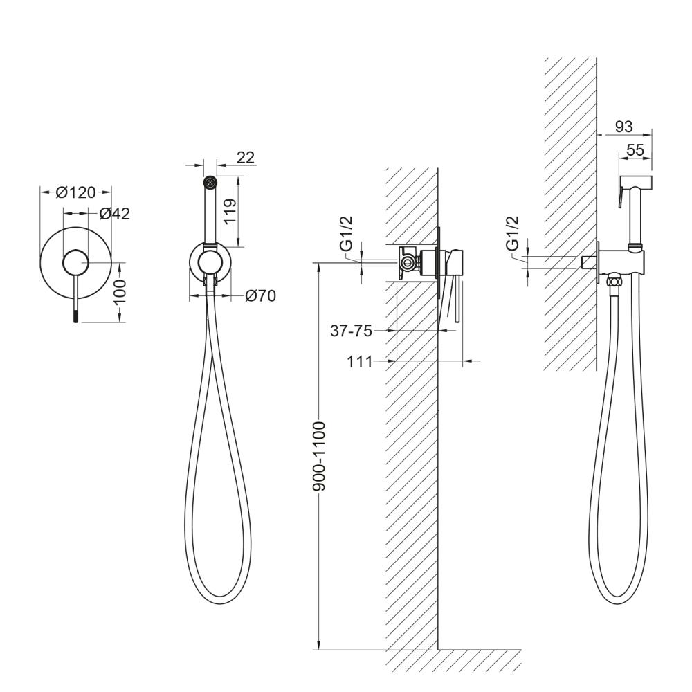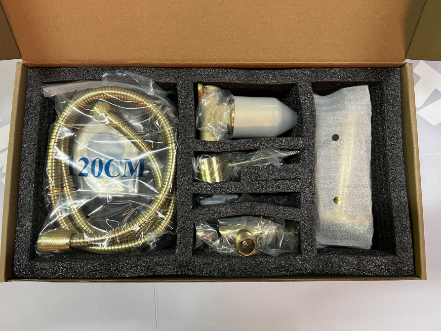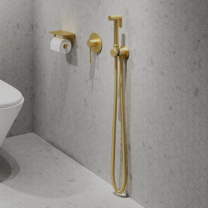 Смеситель скрытого монтажа- 1 шт.Декоративная накладка смесителя (латунная) - 1 шт.Ручка управления смесителем - 1 шт.Шланг душа 1,2 м - 1 шт.Отвод из стены - держатель лейки (латунный) - 1 шт.Гигиеническая лейка (пластик) - 1 шт.Инструкция - 1 шт.