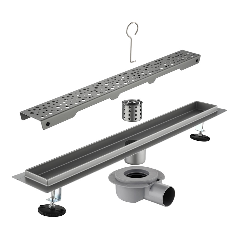 Корпус и декоративная решётка выполнены из нержавеющей стали с износостойким покрытием, устойчивым к влаге, бытовой химии и царапинам. Низкий профиль и продуманная геометрия лотка обеспечивают быстрый отвод воды и комфорт при ежедневном использовании.