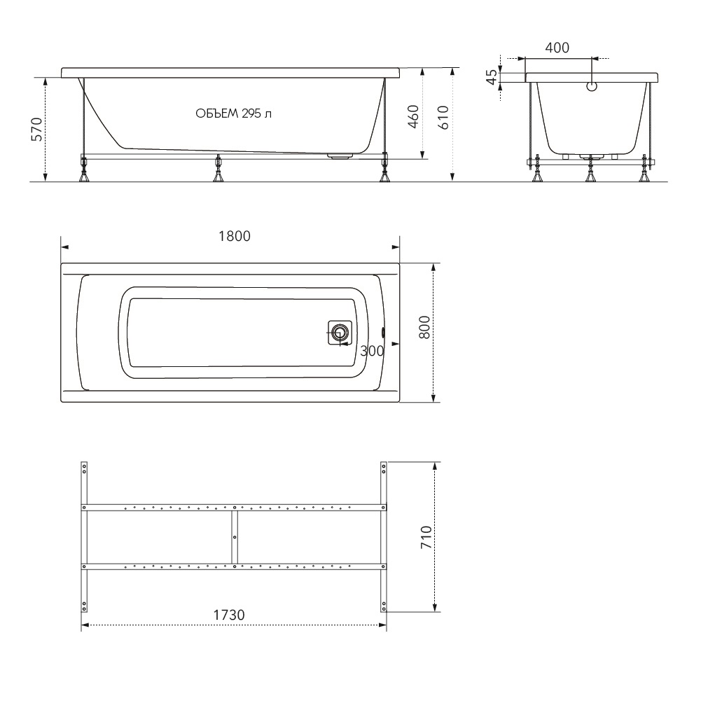 Ванна 180*80*46. Форма - прямоугольная. Для изготовления ванны используется Российский лист АБС/ПММА (сантехнический акрил) от компании «Гибау». Изначальная толщина листа 5 мм., толщина армирующего слоя (стекловолокно+смола) от 2 до 6 мм. (напыляется на разные части дна по разному). На дне ванны идёт закладная — цельное ДСП. Выдерживает нагрузку до 500 кг. Слив скрыт под квадратной декоративной крышкой.