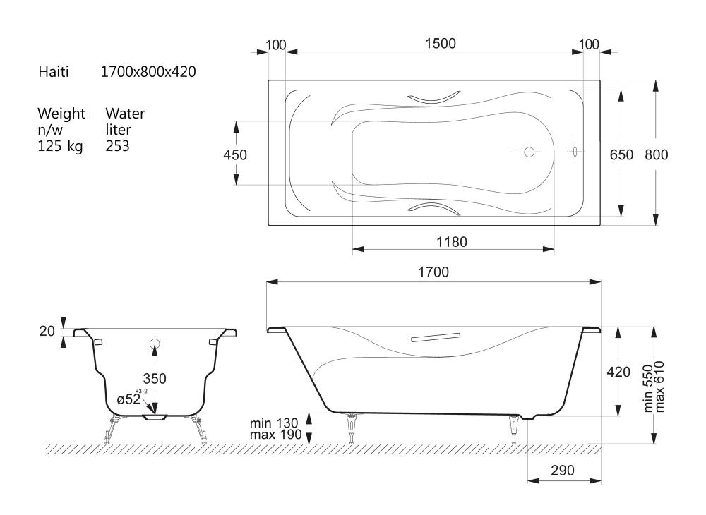 - Глубина до перелива, см - 35, высота на ножках, см - 55-61