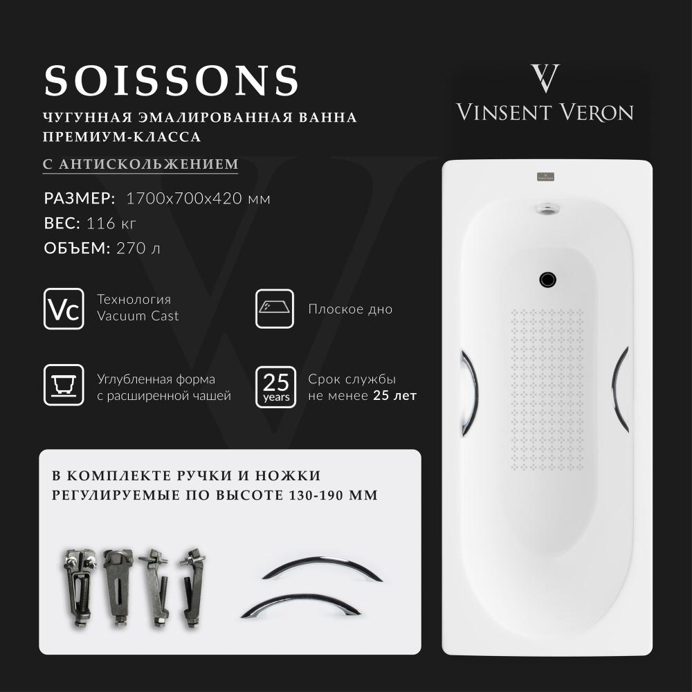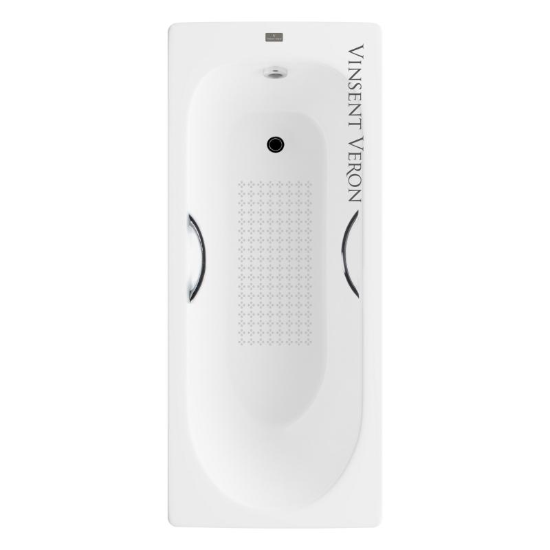 Ванна чугунная Vinsent Veron Soissons170x70x42 с дугообразными хромированнами ручками и антискользящим покрытием VCN1707042H/VH0015CH-AS