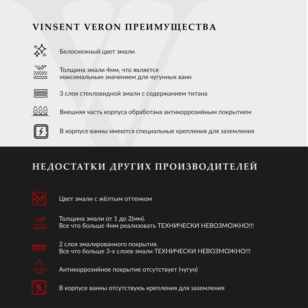 Чугунная ванна Vinsent Veron Square отвечает последним тенденциям в дизайне оформления ванных комнат. Ванна имеет максимально квадратную форму чаши с четкими прямыми линиями, которая придает ей не только оригинальный внешний вид, но и обеспечивает высокую функциональность в использовании за счет абсолютно плоского дна.