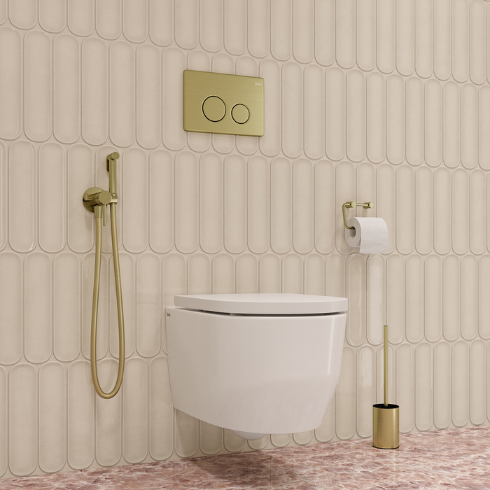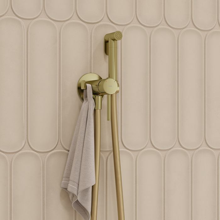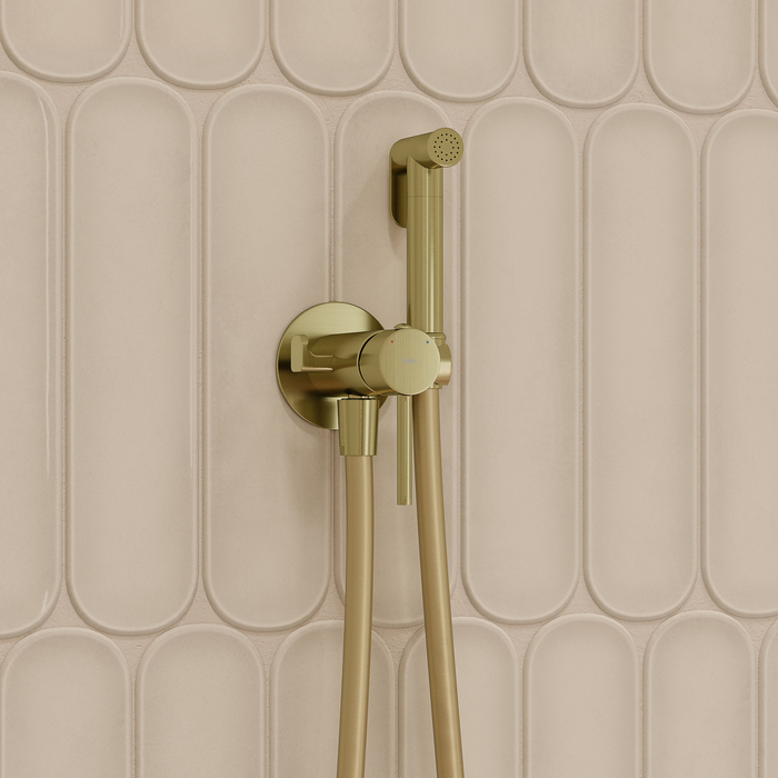 Встраиваемый смеситель с гигиеническим душем Axes в красивом оттенке матового золота – практичный и стильный, его дизайн сочетает в себе трендовый минимализм форм и четкие грани. Имеет крючок для полотенца, который можно установить как слева, так и справа. Гладкий душевой шланг 1,2 м в комплекте.