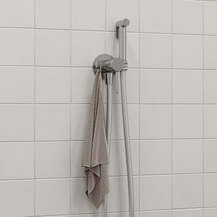 Встраиваемый смеситель с гигиеническим душем Axes в стильном оттенке матового хрома – практичный и стильный, его дизайн сочетает в себе трендовый минимализм форм и четкие грани. Имеет крючок для полотенца, который можно установить как слева, так и справа. Гладкий душевой шланг 1,2 м в комплекте.