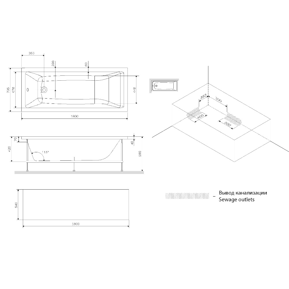 W93A-180-080W-A Gem, ванна акриловая 180x80 см