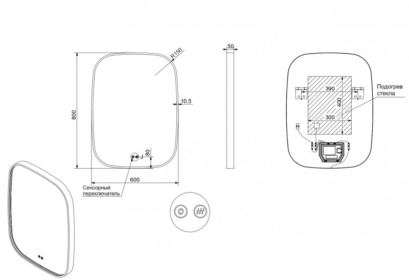 - Двойной выключатель: регулировка цветовой температуры (2700-6500К) и подогрев полотна;