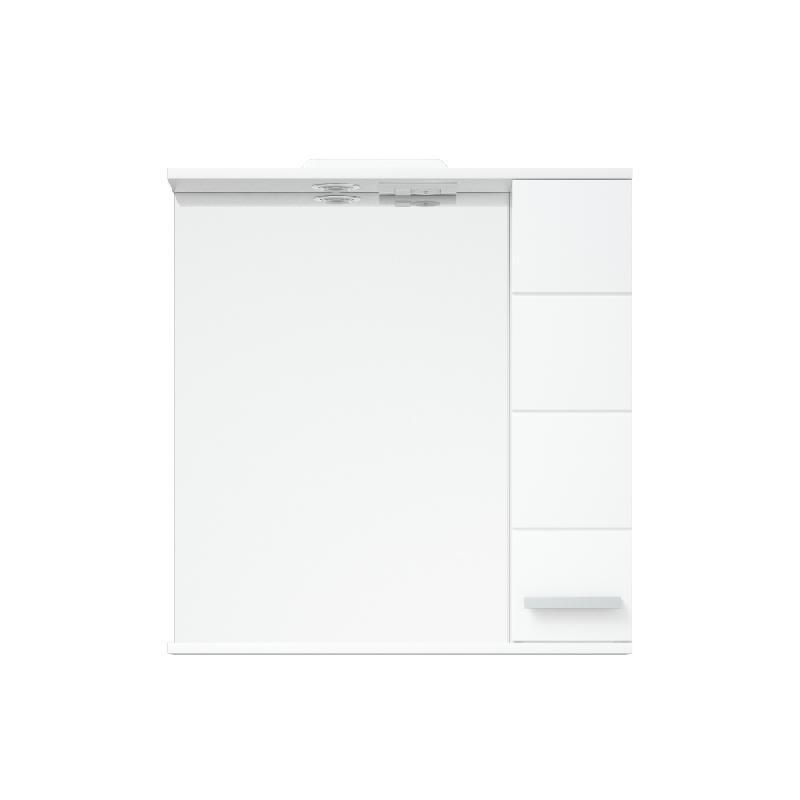 Коллекция "Денвер" - это вдохновление четкостью линий модернизма! Линейка выполнена из влагостойкого МДФ, покрытого белой глянцевой пленкой. Мебель комплектуется фурнитурой высокого качества, дверными петлями со встроенными доводчиками и удобными наклонными ручками. Линейная фрезеровка на фасадах придаст индивидуальность и задаст особый ритм Вашей ванной комнате. Зеркало-шкаф оснащён распашной дверью справа, слева находится зеркало. За дверью расположены полочки. Петли с доводчиками. Зеркало-шкаф - с подсветкой, 1 светильник. Фасад, верхняя и нижние крышки - МДФ в плёнке.